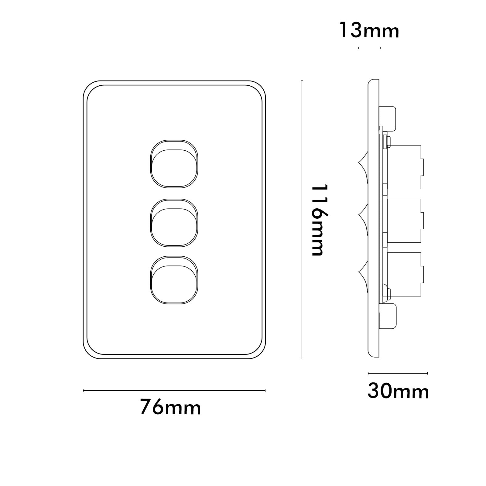 DETA S-Line wall switch features an ultra-low profile face plate with clip-on surround, made from high quality polycarbonate. They are suitable for 2 way switching and include a loop terminal. Installation is easy with the inclusion of a cutout template with all S-Line Series products. Australian and New Zealand standards approved.