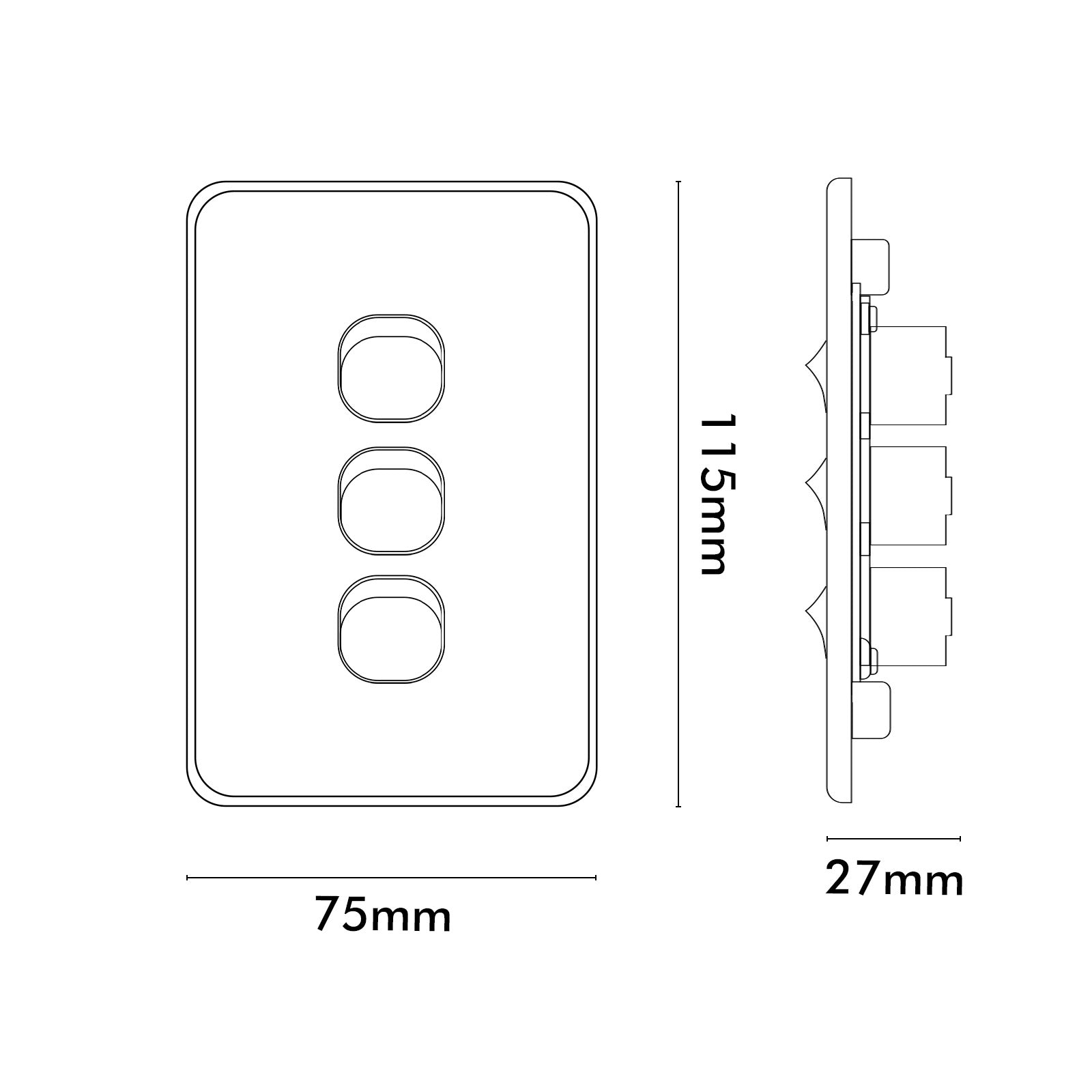 DETA S-Line wall switch features an ultra-low profile face plate with clip-on surround, made from high quality polycarbonate. They are suitable for 2 way switching and include a loop terminal. Installation is easy with the inclusion of a cutout template with all S-Line Series products. Australian and New Zealand standards approved.