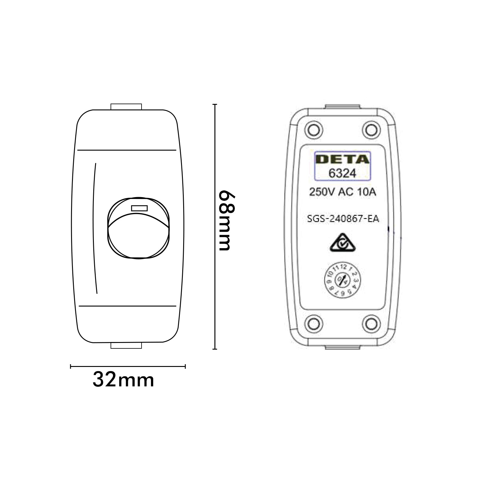 DETA cordline switch has double pole action with screw terminals and earth feed through screw terminal. The unit is designed for round 3 core flexible cords and provides cord grip at entry to reduce strain on terminal connections.