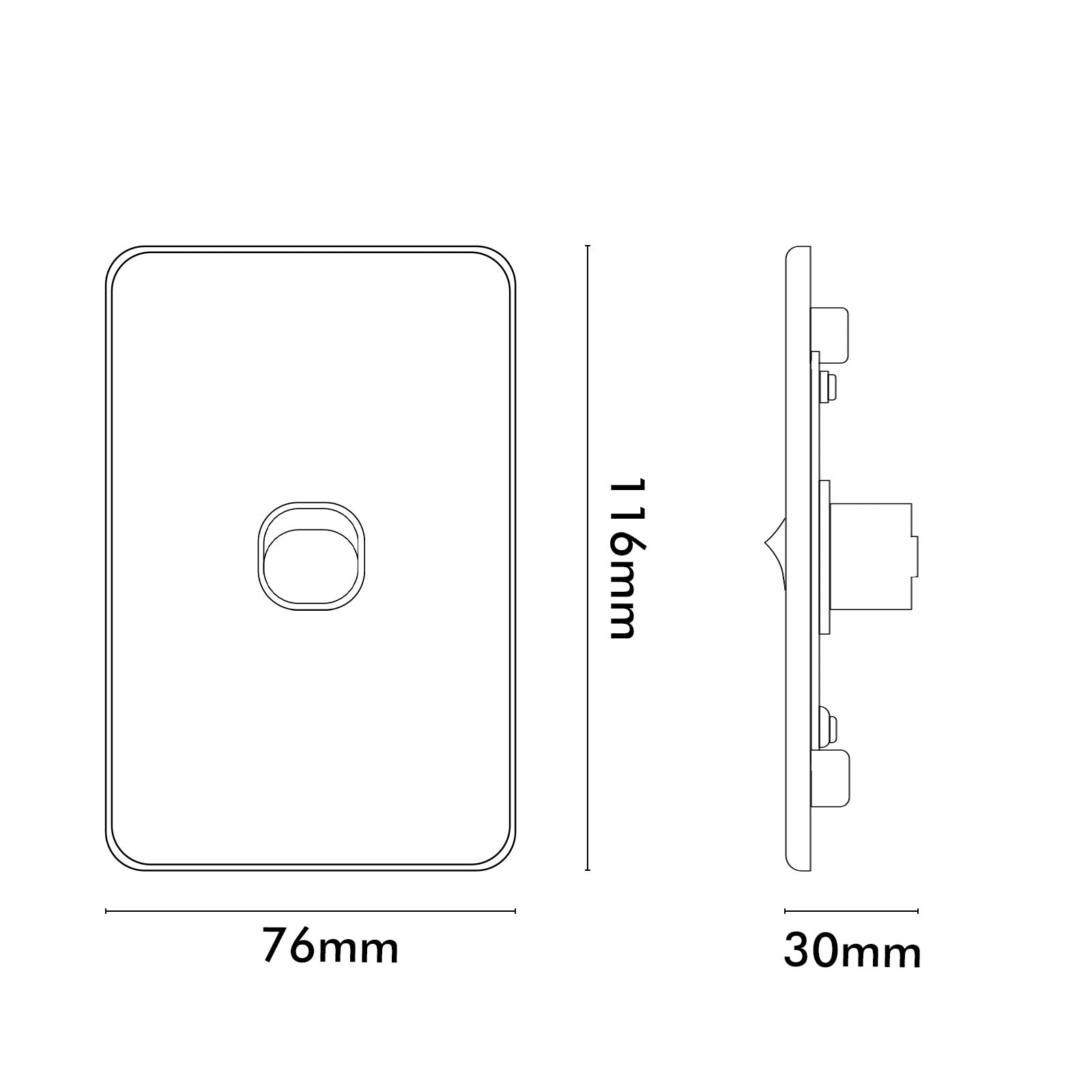 DETA S-Line wall switch features an ultra-low profile face plate with clip-on surround, made from high quality polycarbonate. They are suitable for 2 way switching and include a loop terminal. Installation is easy with the inclusion of a cutout template with all S-Line Series products. Australian and New Zealand standards approved.