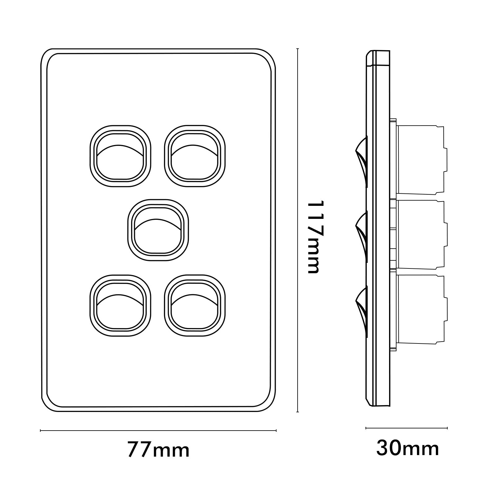 DETA five gang vertical light switch provides multiple switch positions in one location. All switches are suitable for 2 way switching and include a loop terminal. It also features new classic design flush clip on cover.