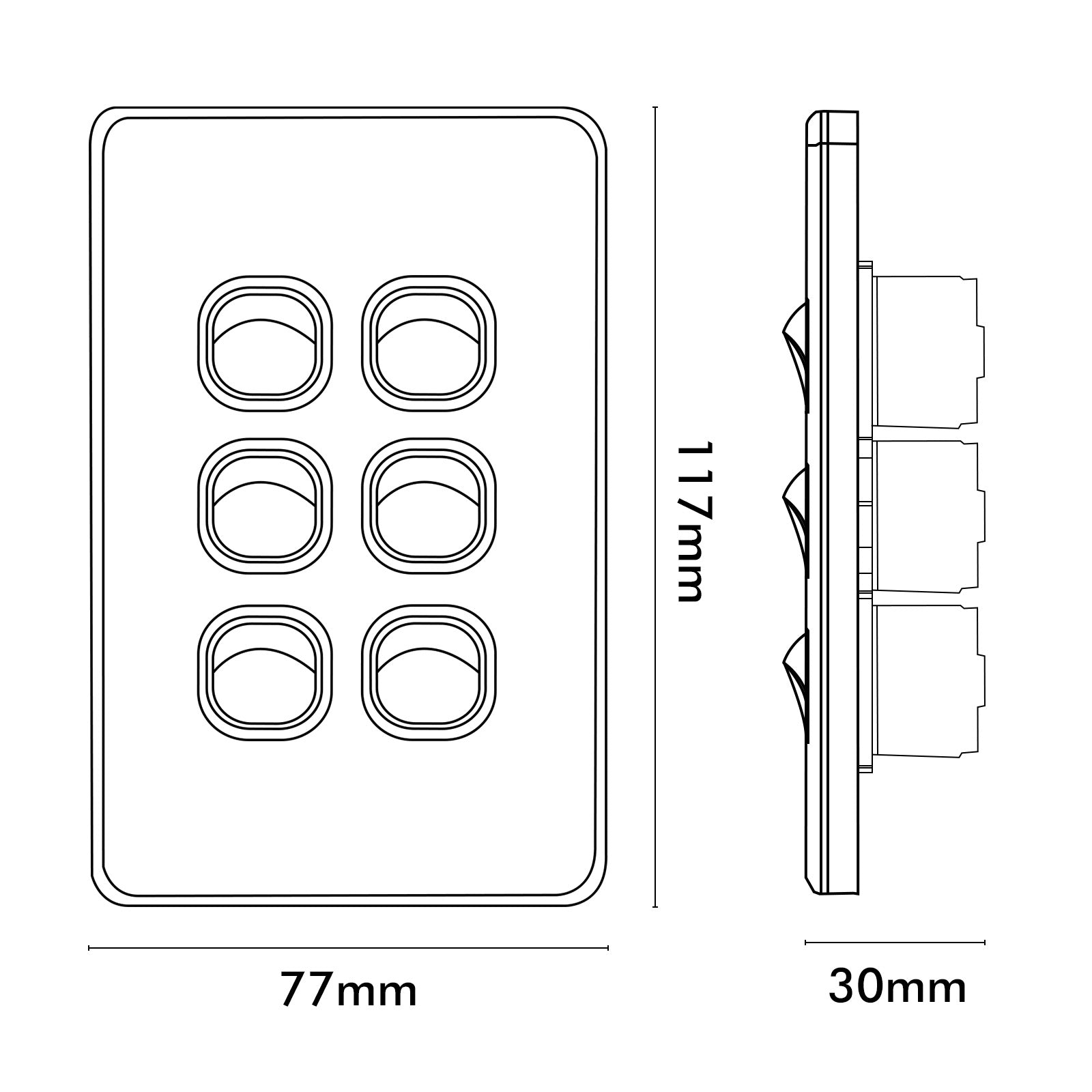 DETA six gang vertical light switch provides multiple switch positions in one location. All switches are suitable for 2 way switching and include a loop terminal. It also features new classic design flush clip on cover.